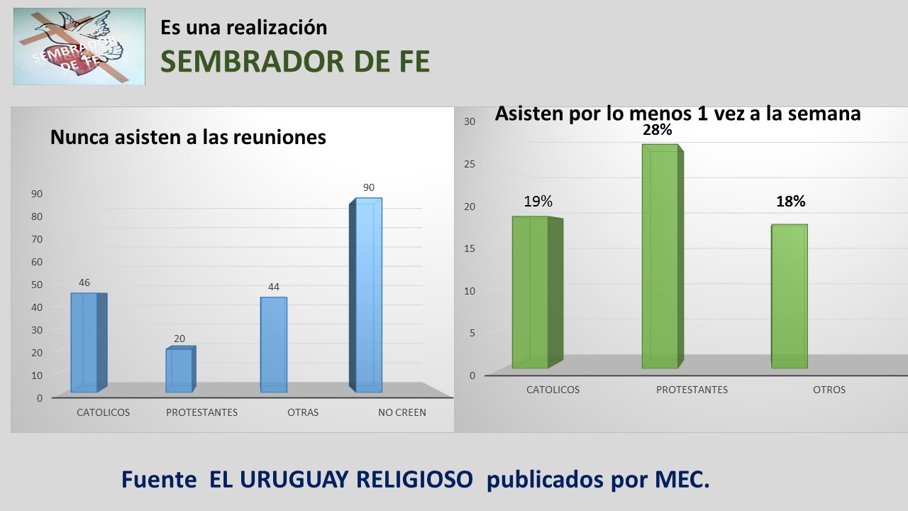 Tenemos una realidad bastante abrumadora ya que tenemos un 20% de los que se consideran protestantes que no se congrega nunca, un 28% se congrega una o más veces por semana, lo que arroja que un 52% de los protestantes son esporádicos, casi diría accidentales, ya que asisten algunas veces al año, pero se puede dar que por razones coyunturales del país, de la sociedad o personales produzcan asistencias a las reuniones, también los programas atractivos, o eventos atrayentes pueden provocar que se muevan y asistir a las diferentes congregaciones o cultos y permanecer un tiempo allí.