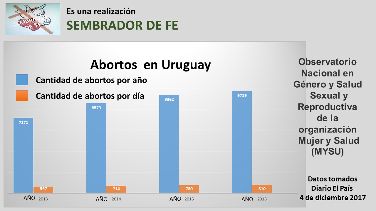 Según un reciente informe del Observatorio Nacional en Género y Salud Sexual y Reproductiva de la organización Mujer y Salud (MYSU), antes de la implementación de la ley se estimaban entre 16.000 y 33.000 abortos clandestinos por año. El informe constata que el uso de los servicios legales va en aumento de forma progresiva pero no ha sustituido la práctica clandestina, la cual continúa apareciendo como prevaleciente. Aun así, no hay estimaciones de cuántos son los abortos que se realizan por fuera del marco legal en la actualidad. (El País 4 de diciembre de 2017)
